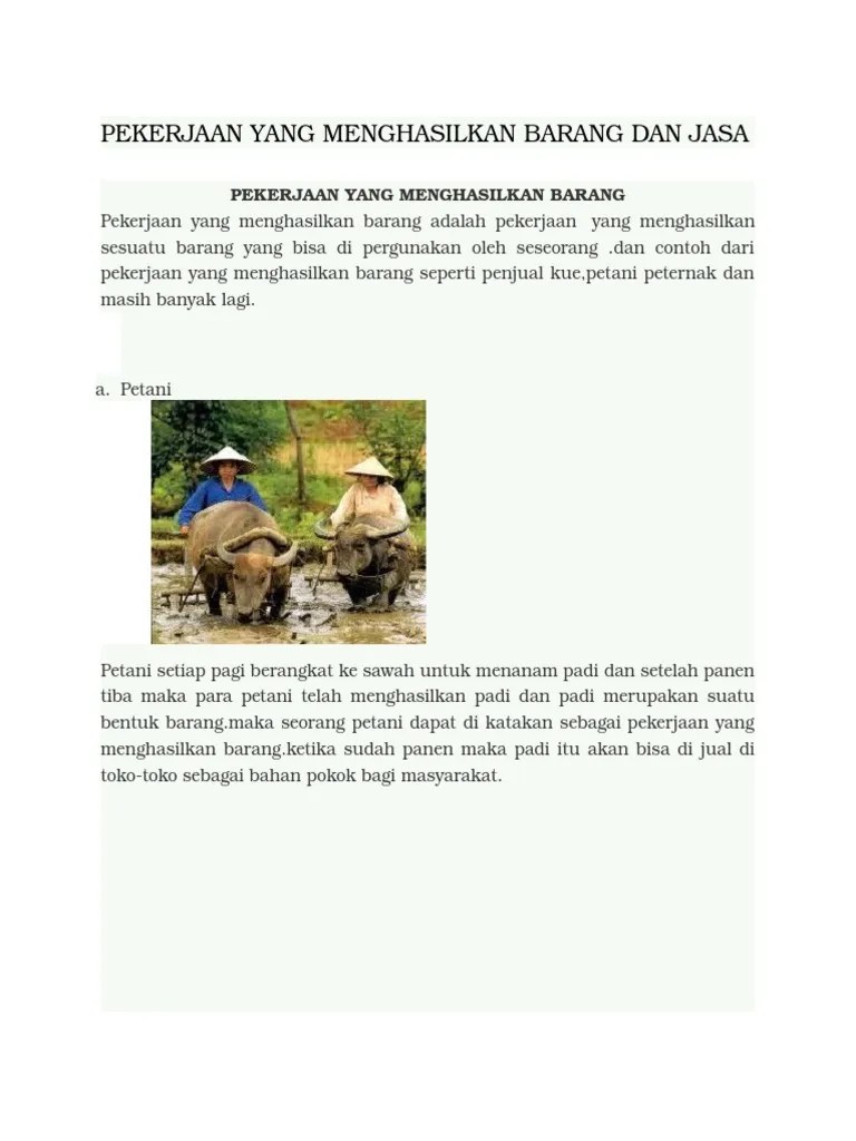 Pekerjaan yang menghasilkan jasa · 1. Pekerjaan terbagi dua, yaitu pekerjaan yang menghasilkan barang dan pekerjaan menghasilkan jasa. Pekerjaan merupakan bentuk kegiatan ekonomi, yang dibedakan menjadi pekerjaan yang menghasilkan barang dan pekerjaan yang menghasilkan jasa. Pekerjaan, work, jobs that produce goods, jobs that produce services, pekerjaan yang menghasilkan barang, percetakan menghasilkan buku, . Kegiatan ekonomi adalah semua kegiatan yang dilakukan oleh manusia untuk .